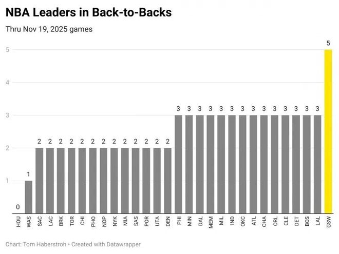 赛季至今联盟各队打背靠背场次,火箭0场,其他球队都是2场或者3场,年龄最大的勇士竟然多达5场!!!