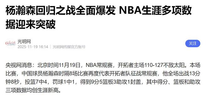 比赛之外,中国球迷最关注的杨瀚森再次遭遇DNP,全场未能获得一分钟出场机会,这已是他本赛季第7次无缘登场,NBA杯3场小组赛更是一场未上。