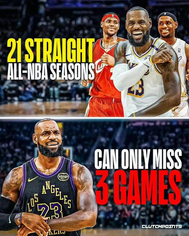 从现在到常规赛结束,勒布朗最多只能再缺席三场比赛才有资格参与奖项评选,包括最佳阵容。而过去21年他连续入选最佳阵容,这个记录有可能面临中断。
