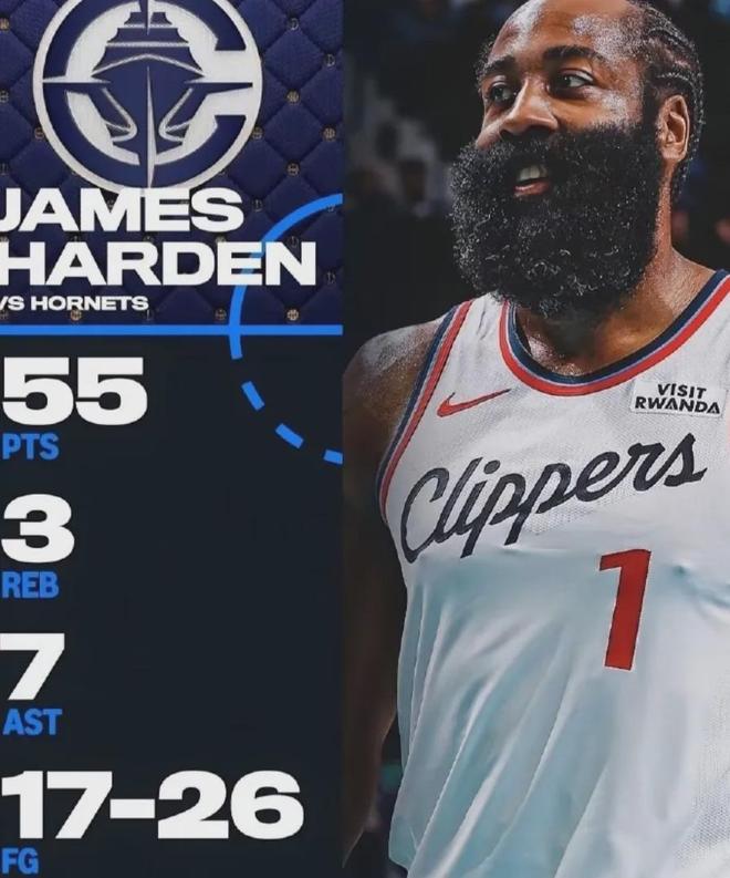 全场比赛出战35分钟,26投17中拿下55分3篮板7助攻,哈登今天打得真好。